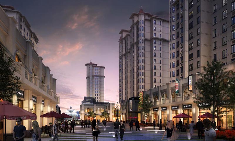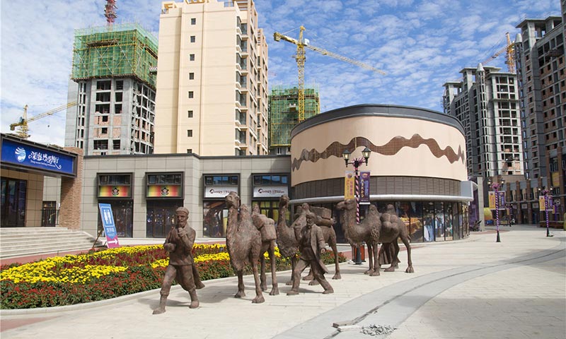 重點打造的絲路金街,由整個項目的主軸線-----商業(yè)步行街及500米帶狀公園組成。整體設計中突出強烈的絲路元素,以“流動的彩綢”為設計靈感,將13000公里長的古絲綢之路全程按1:15000的比例進行了完美濃縮,以沿途最重要城市為節(jié)點打造的五大主題雕塑群將整條金街完美相連。